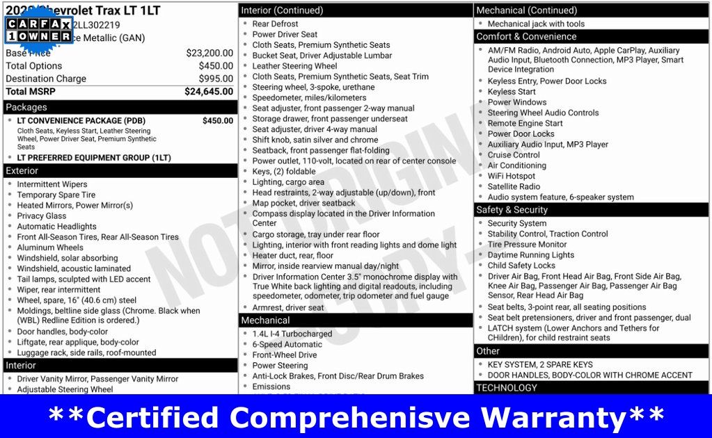 This 2020 Chevrolet Trax LT is a compact SUV that offers impressive versatility and value. With its ECOTEC 1.4L turbocharged engine, you'll enjoy a spirited performance and an EPA-estimated 26 city/31 highway MPG. The clean Carfax history and single-owner status provide peace of mind, while the LT Convenience Package adds premium features like keyless entry, push-button start, power driver's seat, and a leather-wrapped steering wheel.