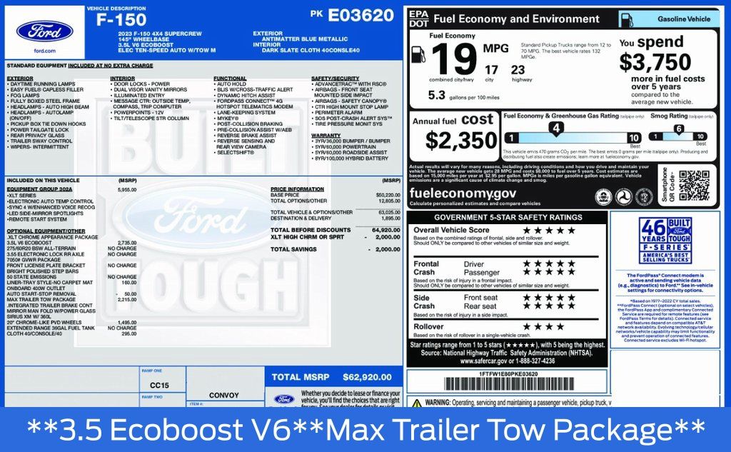 This 2023 Ford F-150 XLT is the perfect blend of capability, comfort, and style. Featuring a powerful 3.5L V6 EcoBoost engine, 4-wheel drive, and a tow package, this truck is ready to tackle any job or adventure. The eye-catching blue exterior is complemented by the chrome accents and 18" wheels, giving it a bold and refined appearance.