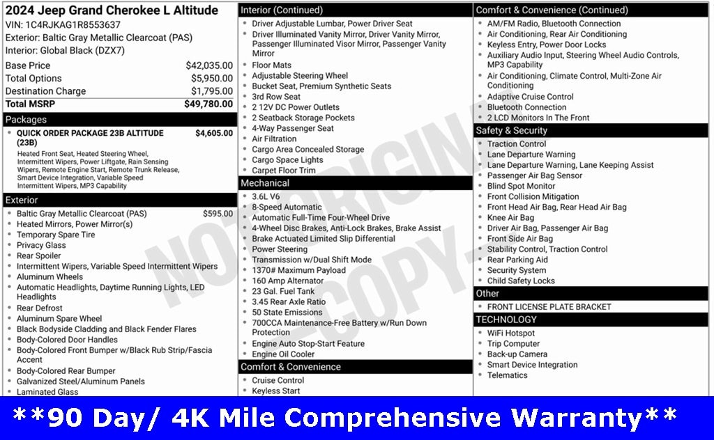 Grand Cherokee L Altitude, 3.6L V6 24V VVT, 4WD, Baltic Gray Metallic Clearcoat, *3rd ROW SEATS*, *4WD*, *APPEARANCE PACKAGE*, *APPLE CARPLAY & ANDROID AUTO*, *BLIND SPOT MONITORING SYSTEM*, *FULLY SERVICED*, *HANDSFREE BLUETOOTH*, *HEATED SEATS*, *HEATED STEERING WHEEL*, *LANE DEPARTURE WARNING*, *OIL CHANGES for LIFE*, *PREMIUM WHEELS*, *REAR POWER LIFTGATE*, *REMOTE START*, *SUPER BUY*, *VERY CLEAN*, 115V Auxiliary Power Outlet, 3rd Row Charge-Only USB Ports, Altitude Appearance Package, Black Headliner, Capri Leatherette/Suede Seats, Delete Laredo Badge, Gloss Black Exterior Accents, Heated Front Seats, Heated Steering Wheel, Power Liftgate, Quick Order Package 23B Altitude, Rain Sensitive Windshield Wipers, Remote Start System, Selectable Tire Fill Alert, Wheels: 18" x 8.0" Fully Painted Aluminum, Wireless Charging Pad. 2024 Jeep Grand Cherokee L Altitude 4WD 8-Speed Automatic 3.6L V6 24V VVT Baltic Gray Metallic Clearcoat Your Best Price on Any New Ford Is at Alma Ford. Under new ownership and family-run, Alma Ford delivers a best price guarantee on every new Ford and top dollar for your trade. Weâre actively adding inventory â" which means we wonât be beat on trade-in value. Every vehicle is fully detailed and safety inspected by certified technicians, giving you confidence from day one. Our team is committed to a straightforward, no-pressure buying experience. â" Best Price Guarantee â" We Pay More for Trades â" Home Delivery Available We stock a wide selection of new and pre-owned vehicles, including Bronco, Escape, Edge, Explorer, Expedition, F-150, Super Duty (F-250 / F-350), Maverick, Mustang, Mach-E, Ranger, Transit, and more. ð" Call 989-699-5260 to schedule a test drive ð View inventory at www.almaford.com ð" Visit us at 2051 W. Monroe, Alma, MI 48801 Alma Ford â" under new ownership and ready to earn your business.