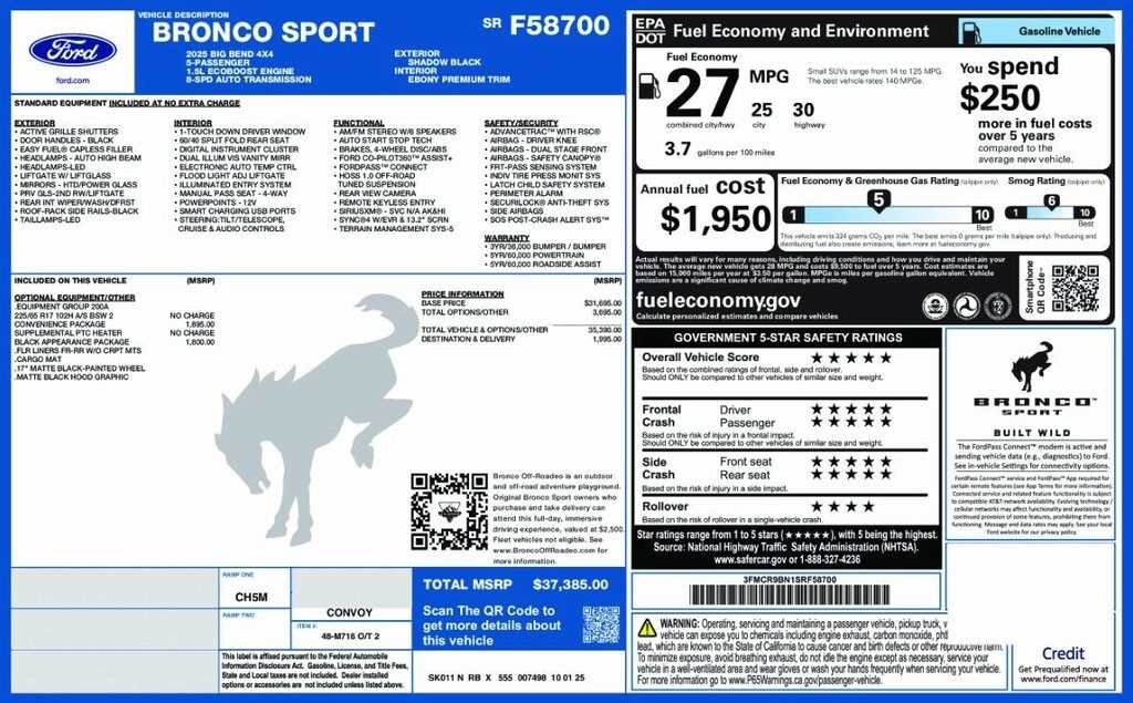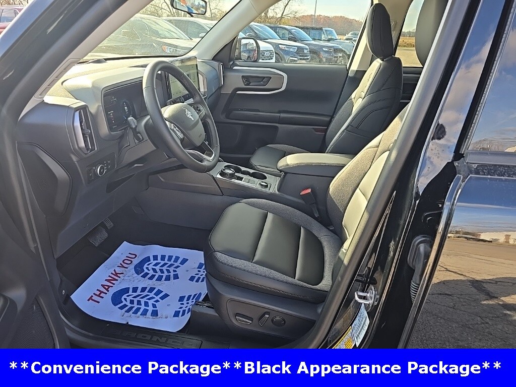 I got a 2025 Big Bend with the black diamond off road package. The steel modular front and rear in combination with bush guard gives this year model. A very aggressive off road look. With the ability to easily mount accessories and power them with the factory installed auxiliary switches. Hitch receiver seamlessly mounted into the rear steel bumper flanked by some very chunky recovery points. The upgraded aluminum rims wrapped with Continental all-terrains. It make this the most capable bronco sport yet. The interior of the 2025 has been updated with a new 13 inch touchscreen with Android Auto and apple car play. The lines of the dash flow elegantly from the new infotainment screen to the new all digital 12 inch gauge chaster. Toggling through the different modes on the gauge chaster is very intuitive, and all the displays are laid out very cleanly. Moving from gauge chaster the center storage cubby just below the infotainment screen there is a wireless charger and USB/ USB-c ports. The passenger side of that same cubby gets a handle and a matching one on the roof just in case the driver bucks a little too much. The passenger also gets a mesh storage area. That leads us to the fact this vehicle has tons of storage options all throughout. You have pockets on the sides of the front two seat big enough for the latest new phones. Very generous door storage on all four doors plus huge glove box and center console with 12 volt outlet. The back side of the center console has air vents and another 12 volt outlet plus a 110 outlet. Now getting to the cargo area it is massive for a crossover SUV. With off road package you get a cargo management system and a very nice rubber mat. Under that there is a full size tire plus scissor jack and funnel to use with the capless filler system. On the liftgate there isa pair of very bright led lights turned on with a switch in the cargo area. This feature packed vehicle has tons awesome gadgets and hidden a little homages I spend all day just talk that. At the end of the day it is car. So how does it drive. It is wonderful, the steering and pedal response is beautiful. Rides very smooth and little to no road noise going down the highway. The active cruise control and co-pilot 360 have been very handy. The car literally drives itself most of the time. There is not enough good things I could same about this car. I love it and you pick one too. You will see what I mean.