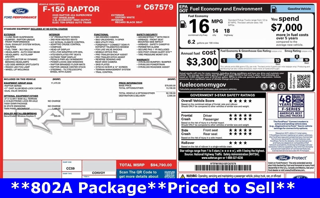 SuperCrew Cabin for Full-Size Comfort & Capability4WD. 2025 Ford F-150 Raptor Oxford White 2025 Ford F-150 Raptor 4WD 10-Speed Automatic 3.5L V6 EcoBoost