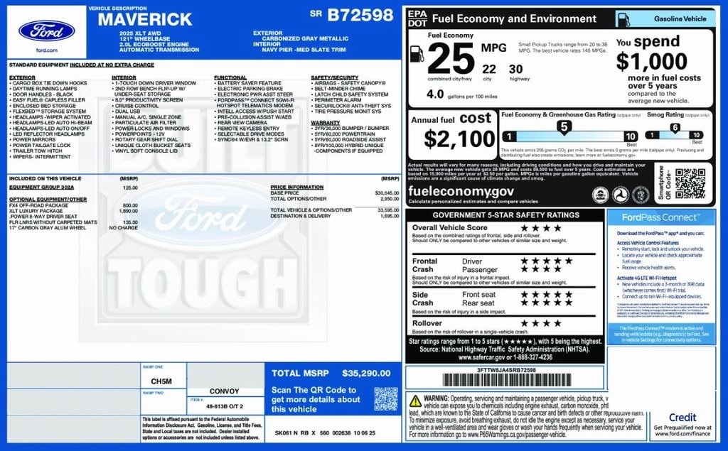 *4WD*, *JUST ARRIVED*, *, *OIL CHANGES for LIFE*, *SUPER BUY*. 2025 Ford Maverick XLT Gray YOUR BEST PRICE on ANY NEW FORD is at Alma Ford. Get the MOST MONEY for your TRADE and BEST PRICE GUARANTEE on ANY NEW FORD! Alma Ford is your #1 choice in Michigan to get the BEST PRICE on any NEW Ford and HOME of the OIL Changes for LIFE*. The Alma Ford team is ready to provide you with a world-class experience, ensuring that you find the perfect vehicle that fits all your needs. Every vehicle has been through a 172 point safety inspection completed by a certified technicians and fully detailed. We sell many makes and models, Pre-Owned Ford Vehicles 2025-2024-2023-2022-2021-2020-2019-2018-2017-2016-2015-2014-2013-2012-2011-2010 Ford Bronco, Bronco Sport, Edge, Escapes, Expedition, Explorer, Fusions, Focus, Flex, F-150 Series, F-250, F-350, Super Duty Diesel Trucks, Maverick, Mustang MACH-E, Mustang, Ranger, Transit, and more For sale. Take advantage of our VIP experience by calling 989-699-5260 to schedule a test drive. Read our customer reviews at www.almaford.com/customer-testimonials or view our entire selection of new and preowned vehicles at www.almaford.com, or stop by today, located at 2051 W Monroe, Alma, MI 48801. 2025 Ford Maverick XLT AWD 8-Speed Automatic EcoBoost 2.0L I4 GTDi DOHC Turbocharged VCT