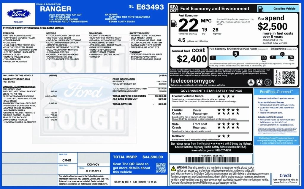 *4WD*, *ADAPTIVE CRUISE*, *APPEARANCE PACKAGE*, *FACTORY TOW Package*, *, *OIL CHANGES for LIFE*, *REMOTE START*, *SUPER BUY*. 2025 Ford Ranger XLT Ruby Red YOUR BEST PRICE on ANY NEW FORD is at Alma Ford. Get the MOST MONEY for your TRADE and BEST PRICE GUARANTEE on ANY NEW FORD! Alma Ford is your #1 choice in Michigan to get the BEST PRICE on any NEW Ford and HOME of the OIL Changes for LIFE*. The Alma Ford team is ready to provide you with a world-class experience, ensuring that you find the perfect vehicle that fits all your needs. Every vehicle has been through a 172 point safety inspection completed by a certified technicians and fully detailed. We sell many makes and models, Pre-Owned Ford Vehicles 2025-2024-2023-2022-2021-2020-2019-2018-2017-2016-2015-2014-2013-2012-2011-2010 Ford Bronco, Bronco Sport, Edge, Escapes, Expedition, Explorer, Fusions, Focus, Flex, F-150 Series, F-250, F-350, Super Duty Diesel Trucks, Maverick, Mustang MACH-E, Mustang, Ranger, Transit, and more For sale. Take advantage of our VIP experience by calling 989-699-5260 to schedule a test drive. Read our customer reviews at www.almaford.com/customer-testimonials or view our entire selection of new and preowned vehicles at www.almaford.com, or stop by today, located at 2051 W Monroe, Alma, MI 48801. 2025 Ford Ranger XLT 4WD 10-Speed Automatic EcoBoost 2.3L I4 GTDi DOHC Turbocharged VCT