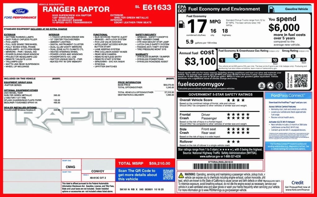 *JUST ARRIVED*, *, *NAVIGATION*, *OIL CHANGES for LIFE*, *REMOTE START*, *SPRAY in BEDLINER*, *SUPER BUY*, 4WD, Heated front seats, Leather-Trimmed Front Heated Bucket Seats, Remote keyless entry, Tough Bed Spray-In Bedliner. 2025 Ford Ranger Raptor Green YOUR BEST PRICE on ANY NEW FORD is at Alma Ford. Get the MOST MONEY for your TRADE and BEST PRICE GUARANTEE on ANY NEW FORD! Alma Ford is your #1 choice in Michigan to get the BEST PRICE on any NEW Ford and HOME of the OIL Changes for LIFE*. The Alma Ford team is ready to provide you with a world-class experience, ensuring that you find the perfect vehicle that fits all your needs. Every vehicle has been through a 172 point safety inspection completed by a certified technicians and fully detailed. We sell many makes and models, Pre-Owned Ford Vehicles 2025-2024-2023-2022-2021-2020-2019-2018-2017-2016-2015-2014-2013-2012-2011-2010 Ford Bronco, Bronco Sport, Edge, Escapes, Expedition, Explorer, Fusions, Focus, Flex, F-150 Series, F-250, F-350, Super Duty Diesel Trucks, Maverick, Mustang MACH-E, Mustang, Ranger, Transit, and more For sale. Take advantage of our VIP experience by calling 989-699-5260 to schedule a test drive. Read our customer reviews at www.almaford.com/customer-testimonials or view our entire selection of new and preowned vehicles at www.almaford.com, or stop by today, located at 2051 W Monroe, Alma, MI 48801. 2025 Ford Ranger Raptor 4WD 10-Speed Automatic 3.0L EcoBoost V6