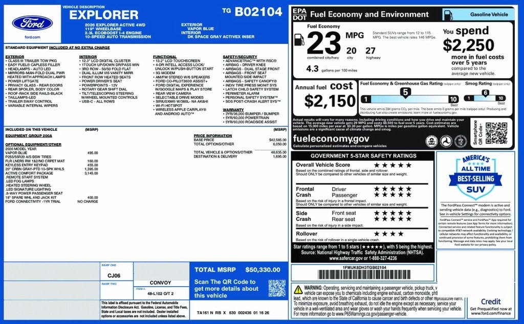 4WD, *LEATHER HEATED POWER SEATS*, *OIL CHANGES for LIFE*, *TOW PACKAGE*. 2026 Ford Explorer Active Vapor Blue Metallic Your Best Price on Any New Ford Is at Alma Ford. Under new ownership and family-run, Alma Ford delivers a best price guarantee on every new Ford and top dollar for your trade. Weâre actively adding inventory â" which means we wonât be beat on trade-in value. Every vehicle is fully detailed and safety inspected by certified technicians, giving you confidence from day one. Our team is committed to a straightforward, no-pressure buying experience. â" Best Price Guarantee â" We Pay More for Trades â" Home Delivery Available We stock a wide selection of new and pre-owned vehicles, including Bronco, Escape, Edge, Explorer, Expedition, F-150, Super Duty (F-250 / F-350), Maverick, Mustang, Mach-E, Ranger, Transit, and more. ð" Call 989-699-5260 to schedule a test drive ð View inventory at www.almaford.com ð" Visit us at 2051 W. Monroe, Alma, MI 48801 Alma Ford â" under new ownership and ready to earn your business. 2026 Ford Explorer Active 4WD 10-Speed Automatic 2.3L EcoBoost I-4