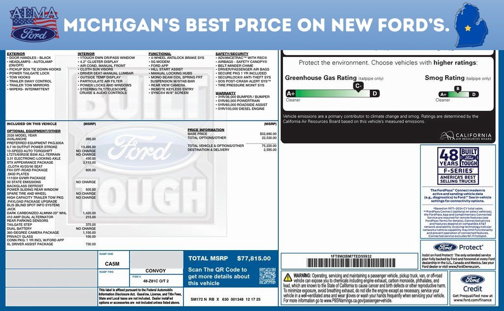 Alma Ford is proud to offer a customer-first experience designed to save you time and money on every new Ford vehicle. Under new ownership and family-run, we are committed to transparent pricing and exceptional service. See dealer for complete details. Dealer is not responsible for pricing errors. All prices plus tax, title, plate, and $280 dealer documentation fee; includes applicable manufacturer rebates. If we don't have the exact new Ford you're looking for, we are currently offering Ford Employee Pricing on 2026 factory orders, allowing you to build your vehicle exactly the way you want at exceptional value. When you purchase a new vehicle from Alma Ford, you'll also receive Lifetime Oil Changes at our dealership. See dealer for complete program details and eligibility. We proudly serve Alma and surrounding communities including Carson City, Ithaca, Mount Pleasant, St. Johns, Saginaw, Midland, Big Rapids, Lakeview, Edmore, Breckenridge, Ashley, Shepherd, Clare, Greenville, Hemlock, Grand Rapids, Lansing, Kalamazoo, Muskegon, Grand Haven, Holland, Wyoming, and customers throughout the state of Michigan. Recent Arrival!