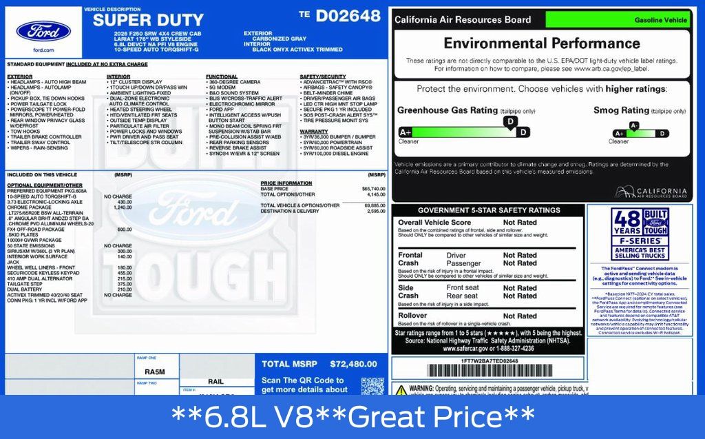 This 2026 Ford F-250SD Lariat is a true workhorse, built to handle the toughest jobs with ease. Featuring an impressive 6.8L V8 engine paired with a 10-speed automatic transmission and 4-wheel drive, this truck is ready to take on any terrain or task you throw its way.