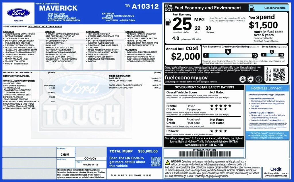 2026 Ford Maverick XLT White New Ford Vehicles â" Best Price Guarantee at Alma Ford Under new ownership and family-run, Alma Ford is your destination for new Ford vehicles at the best possible price. We offer a Best Price Guarantee and top dollar for your trade â" weâre actively buying inventory and wonât be beat on trade-in value. Best Price Guarantee on New Fords We Pay More for Trades Home Delivery Available Looking for something specific? If we donât have exactly what you want, weâre offering Ford Employee Pricing on 2026 factory orders. Build it your way and lock in exceptional savings. Choose from the latest Ford lineup, including F-150, Super Duty, Bronco, Bronco Sport, Escape, Edge, Explorer, Expedition, Maverick, Mustang, Mustang Mach-E, Ranger, Transit, and more. Call 989-699-5260 to get started Browse inventory at www.almaford.com Visit us at 2051 W. Monroe, Alma, MI 48801 Alma Ford â" under new ownership and ready to earn your business. 2026 Ford Maverick XLT AWD 8-Speed Automatic EcoBoost 2.0L I4 GTDi DOHC Turbocharged VCT