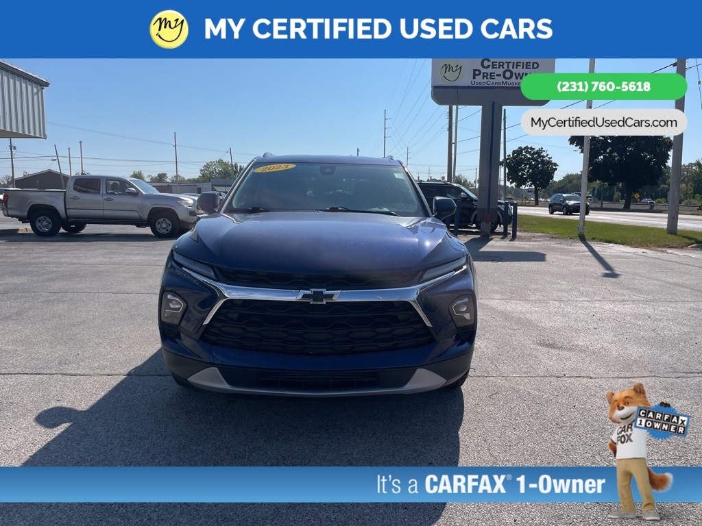*APPLE CARPLAY & ANDROID AUTO*, *CRUISE CONTROL*, *REARVIEW CAMERA*, *REMOTE START*, *SUPER BUY*, *VERY CLEAN*, Adaptive Cruise Control, Black Roof-Mounted Side Rails, Convenience Package, Enhanced Automatic Emergency Braking, Heated Driver & Front Passenger Seats, Inside Rear-View Auto-Dimming Mirror, Preferred Equipment Group 2LT, Rear Power Programmable Liftgate, Universal Home Remote, Wireless Charging. MY Certified Used Cars of Muskegon is your #1 choice in Michigan to get the BEST PRICE on used vehicles and BEST value for your trade. The MY Certified Used Cars team is ready to provide you with a world-class experience, ensuring that you find the perfect vehicle that fits all your needs. Every vehicle has been through a full safety inspection completed by certified technicians and fully detailed. We sell many makes and models, Pre-Owned Vehicles with years from 2025-2024-2023-2022-2021-2020-2019-2018-2017-2016-2015-2014-2013-2012-2011-2010-2009-2008-2007 and all makes Audi, BMW, Chevrolet, Toyota, Volkswagen, Kia, Hyundai, Mercedes, Dodge, Chrysler, Jeep, Ram, Lincoln, Honda, Subaru, and many models like Bronco, Bronco Sport, Edge, Escapes, Expedition, Explorer, Fusions, Focus, Flex, F-150 Series, F-250, F-350, Super Duty Diesel Trucks, Maverick, Mustang MACH-E, Mustang, Ranger, Transit, Wrangler, Grand Cherokee, Grand Cherokee L, Wagoneer, Gladiator, Grand Caravan, RAM, RAM HEMI, and more. Take advantage of our VIP experience by calling 231-760-5618 to schedule a test drive. Read our customer reviews at www.mycertifiedusedcars.com/testimonials or view our entire selection of preowned vehicles at www.mycertifiedusedcars.com, or stop by today, located at 3692 Airline Rd. Muskegon, MI 49444. CARFAX One-Owner. Blue Glow Metallic 2023 Chevrolet Blazer LT FWD 9-Speed Automatic with Overdrive 2.0L Turbocharged Clean CARFAX.