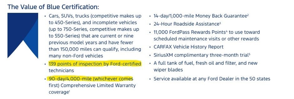 Certification Program Details: 139-Point Inspection completed by Ford-trained technicians 90-Day / 4,000-Mile Comprehensive Limited Warranty 14-Day / 1,000-Mile Money-Back Guarantee 24/7 Roadside Assistance CARFAX® Vehicle History Report Included Vehicles less than 10 years old with fewer than 150,000 miles Transferable warranty for added resale value Service available at any Ford dealer nationwide