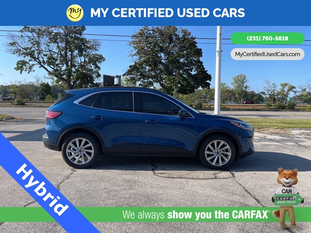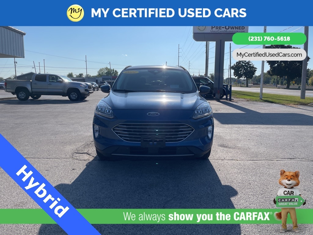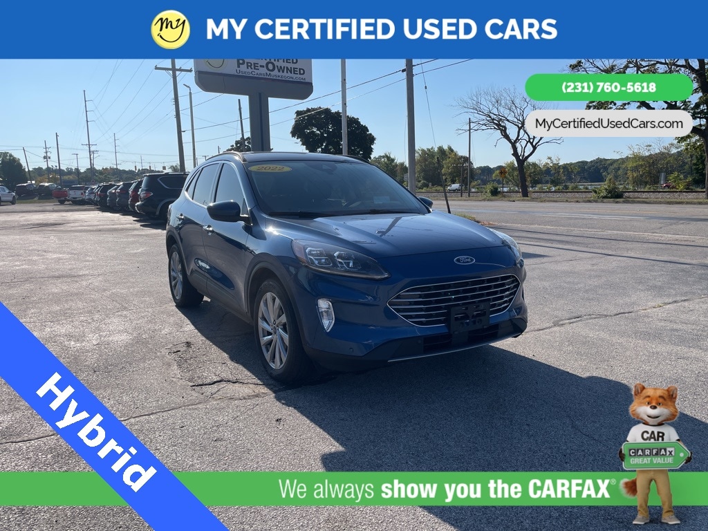 2.5L iVCT, *APPLE CARPLAY & ANDROID AUTO*, *CRUISE CONTROL*, *FULLY SERVICED*, *LEATHER HEATED POWER SEATS*, *REARVIEW CAMERA*, *REMOTE START*, *SUPER BUY*, *VERY CLEAN*, Active Park Assist 2.0, Chrome 5-Bar Upper Grille w/Chrome Surround, Front & Rear Floor Mats, Front & Rear Silver Skid Plates, HD Radio, Head-Up Display, Heated door mirrors, Heated Leather-Trimmed Front Sport Contour Seats, Leather Wrapped Steering Wheel, Memory seat, Navigation System, Power driver seat, Radio: B&O Sound System by Bang & Olufsen, SYNC 3 Communications & Entertainment System, Titanium Elite Package, Wheels: 19" Luster Nickel-Painted Aluminum, Wireless Charging Pad. MY Certified Used Cars of Muskegon is your #1 choice in Michigan to get the BEST PRICE on used vehicles and BEST value for your trade. The MY Certified Used Cars team is ready to provide you with a world-class experience, ensuring that you find the perfect vehicle that fits all your needs. Every vehicle has been through a full safety inspection completed by certified technicians and fully detailed. We sell many makes and models, Pre-Owned Vehicles with years from 2025-2024-2023-2022-2021-2020-2019-2018-2017-2016-2015-2014-2013-2012-2011-2010-2009-2008-2007 and all makes Audi, BMW, Chevrolet, Toyota, Volkswagen, Kia, Hyundai, Mercedes, Dodge, Chrysler, Jeep, Ram, Lincoln, Honda, Subaru, and many models like Bronco, Bronco Sport, Edge, Escapes, Expedition, Explorer, Fusions, Focus, Flex, F-150 Series, F-250, F-350, Super Duty Diesel Trucks, Maverick, Mustang MACH-E, Mustang, Ranger, Transit, Wrangler, Grand Cherokee, Grand Cherokee L, Wagoneer, Gladiator, Grand Caravan, RAM, RAM HEMI, and more. Take advantage of our VIP experience by calling 231-760-5618 to schedule a test drive. Read our customer reviews at www.mycertifiedusedcars.com/testimonials or view our entire selection of preowned vehicles at www.mycertifiedusedcars.com, or stop by today, located at 3692 Airline Rd. Muskegon, MI 49444. Atlas Blue Metallic 2022 Ford Escape Hybrid Titanium AWD eCVT 2.5L iVCT Clean CARFAX.