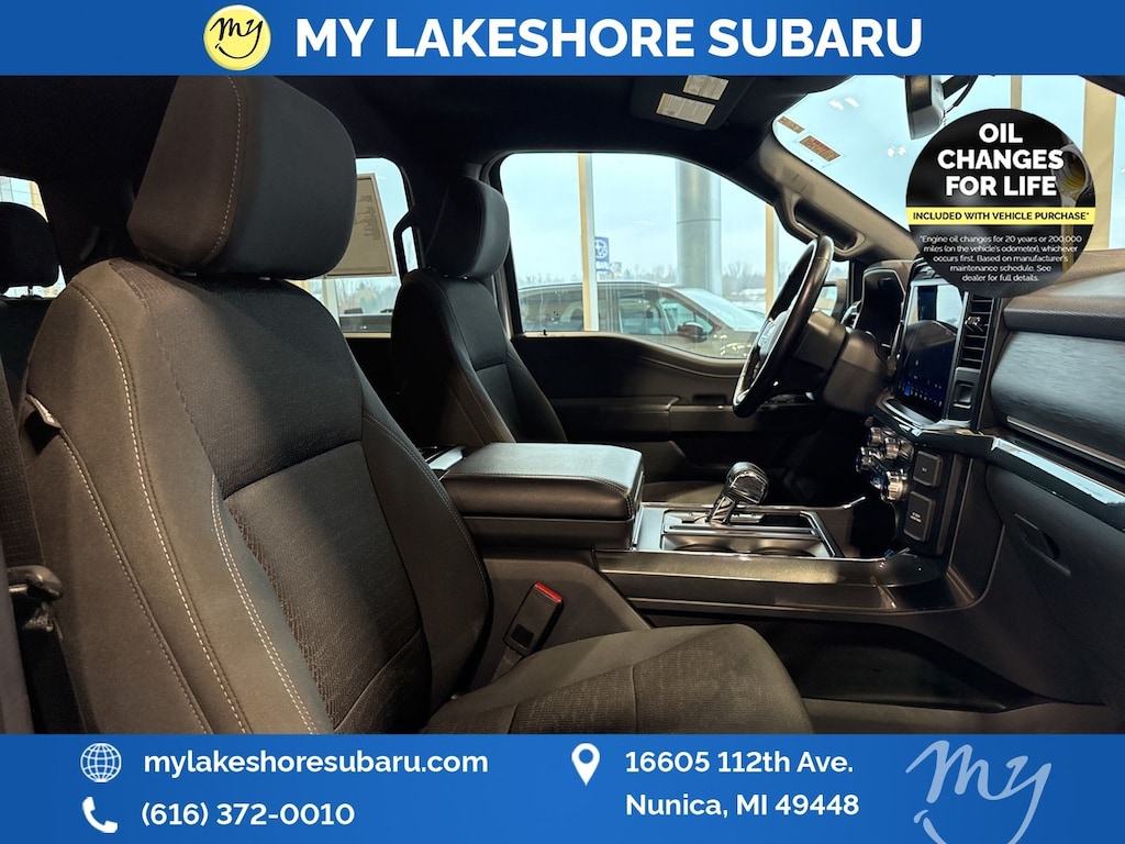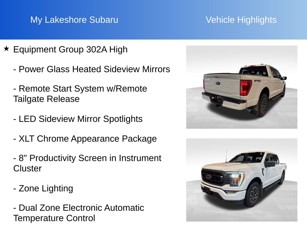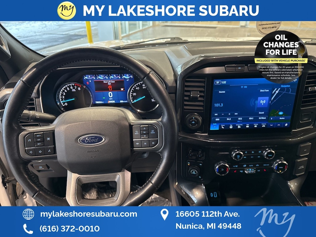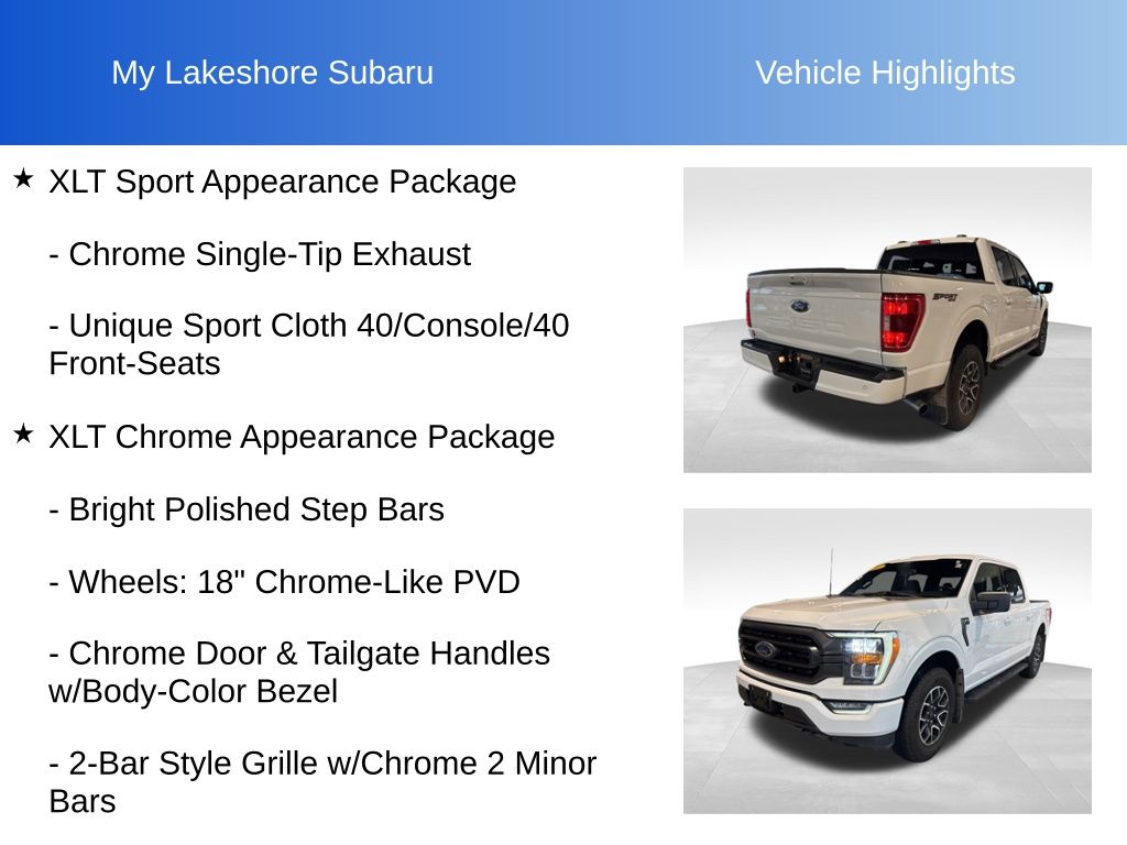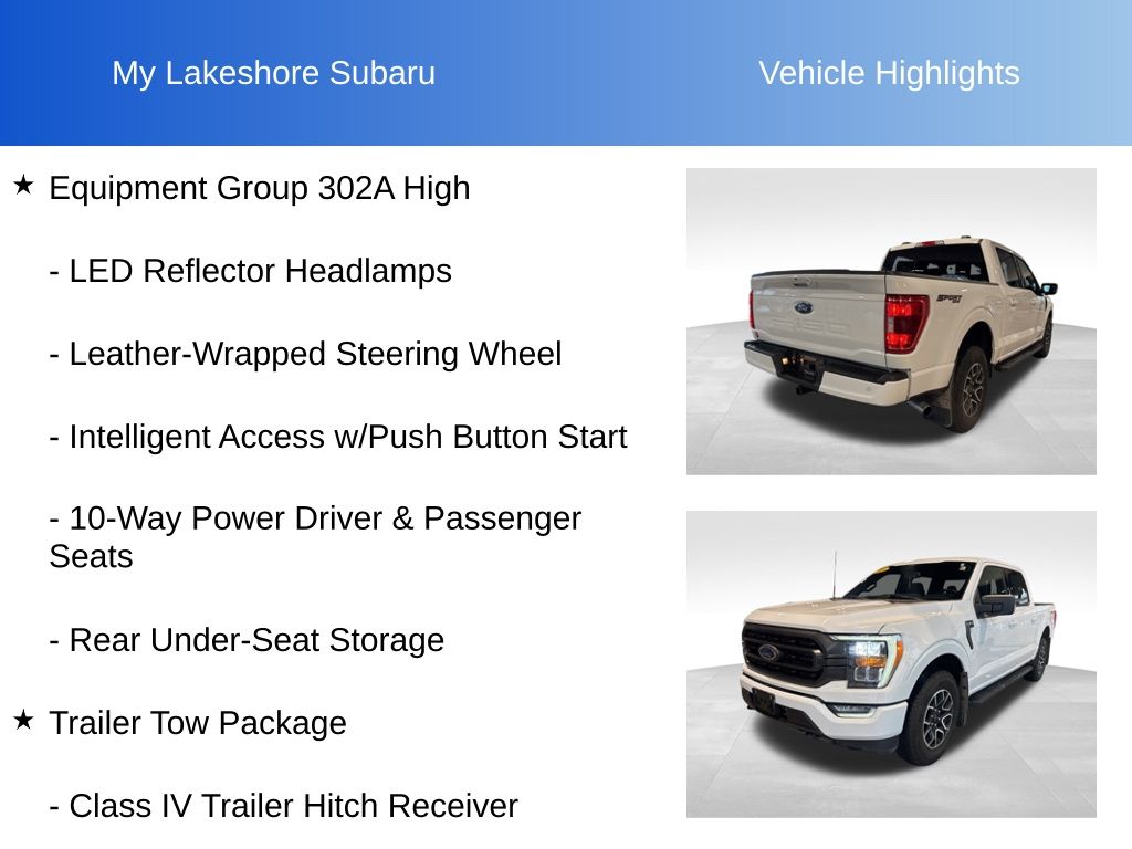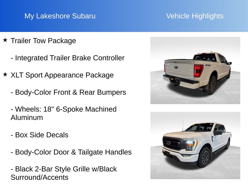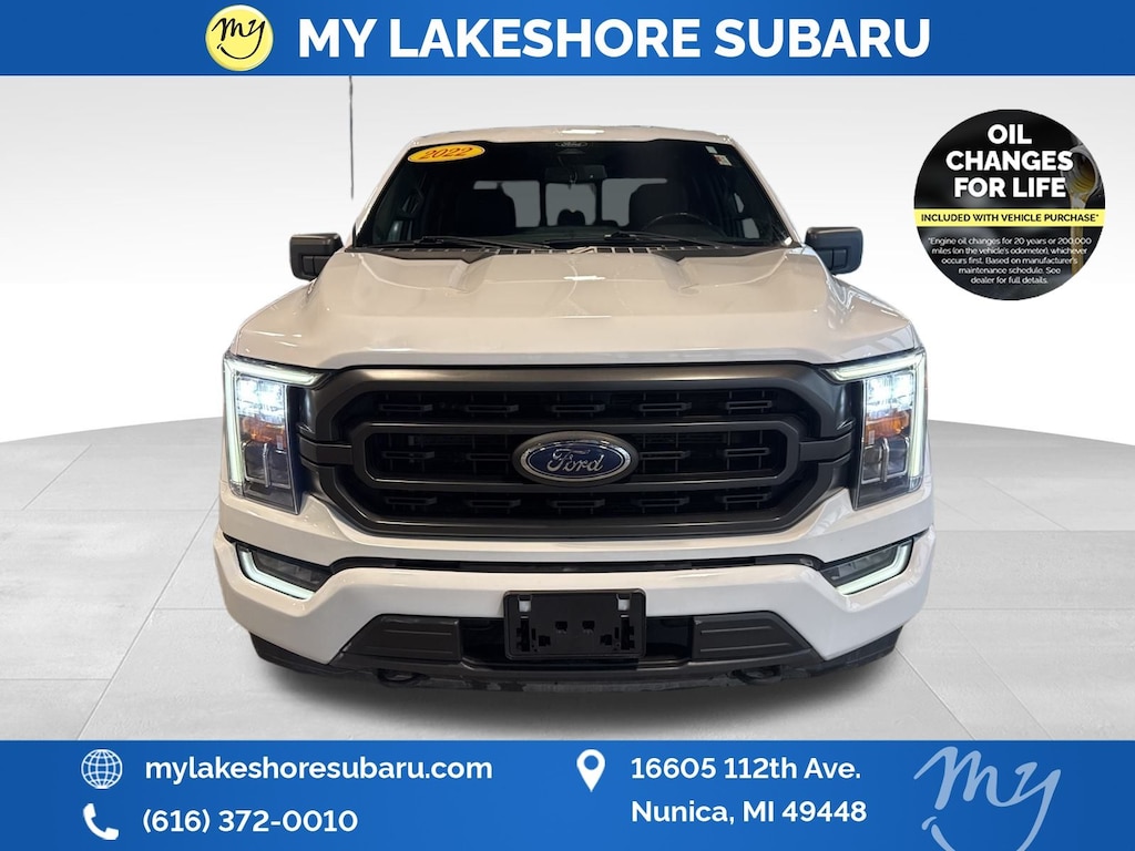 F-150 XLT, 5.0L V8, 4WD, *BACKUP SENSORS*, *BLIND SPOT MONITORING*, *LANE DEPARTURE WARNING*, *OIL CHANGES for LIFE*, 10-Way Power Driver & Passenger Seats, 2-Bar Style Grille w/Chrome 2 Minor Bars, 8" Productivity Screen in Instrument Cluster, ABS brakes, Accent-Color Step Bars, Alloy wheels, Auto-Dimming Rear-View Mirror, Black 2-Bar Style Grille w/Black Surround/Accents, Body-Color Door & Tailgate Handles, Body-Color Front & Rear Bumpers, Box Side Decals, Bright Polished Step Bars, Chrome Door & Tailgate Handles w/Body-Color Bezel, Chrome Single-Tip Exhaust, Class IV Trailer Hitch Receiver, Compass, Dual Zone Electronic Automatic Temperature Control, Electronic Stability Control, Equipment Group 302A High, GVWR: 7,050 lbs Payload Package, Heated door mirrors, Heated Front Seats, Illuminated entry, Integrated Trailer Brake Controller, Intelligent Access w/Push Button Start, Leather-Wrapped Steering Wheel, LED Reflector Headlamps, LED Sideview Mirror Spotlights, Low tire pressure warning, Onboard 400W Outlet, Power Glass Heated Sideview Mirrors, Pro Trailer Backup Assist, Radio: AM/FM SiriusXM w/360L, Rear Under-Seat Storage, Remote keyless entry, Remote Start System w/Remote Tailgate Release, SecuriCode Drivers Side Keyless-Entry Keypad, SYNC 4 w/Enhanced Voice Recognition, Traction control, Trailer Tow Package, Unique Sport Cloth 40/Console/40 Front-Seats, Wheels: 18" 6-Spoke Machined Aluminum, Wheels: 18" Chrome-Like PVD, XLT Chrome Appearance Package, XLT Sport Appearance Package, Zone Lighting. Oxford White 2022 Ford F-150 XLT 4WD 10-Speed Automatic 5.0L V8