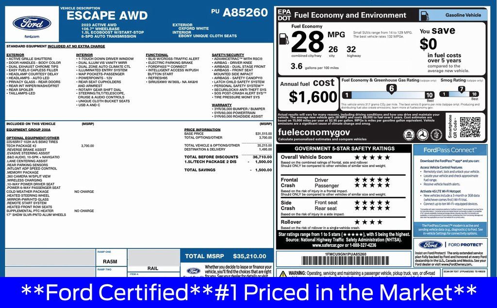 Powered by a 1.5L EcoBoost engine and paired with an 8-speed automatic transmission, this Escape delivers an impressive 26 city/32 highway MPG, ensuring exceptional fuel efficiency. The all-wheel-drive system provides confident handling and traction, making it a great choice for navigating various road conditions.
